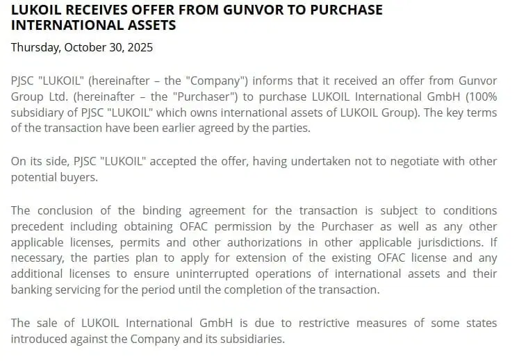 Amerika Birleşik Devletleri’nin (ABD), Rus petrol devleri Rosneft ve Lukoil’e yönelik yaptırım açıklamasının ardından Lukoil, uluslararası varlıklarını satışa çıkaracağını duyurdu.