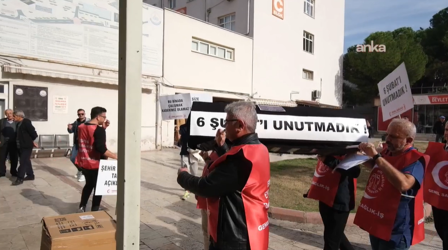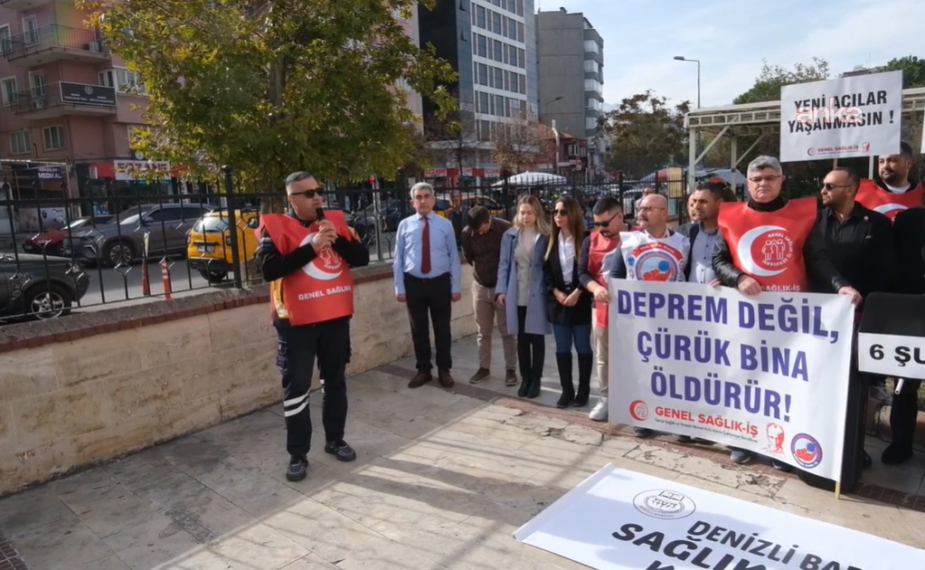 Sendika üyeleri, “Yeni acılar yaşanmasın”, “6 Şubat’ı unutmadık”, “Bu binada çalışmak kaderimiz olamaz” yazılı dövizler taşıdı. Genel Sağlık-İş Denizli Şubesi Başkanı Kazım Boyacıoğlu’nun okduğu açıkladama, şunları kaydedildi: